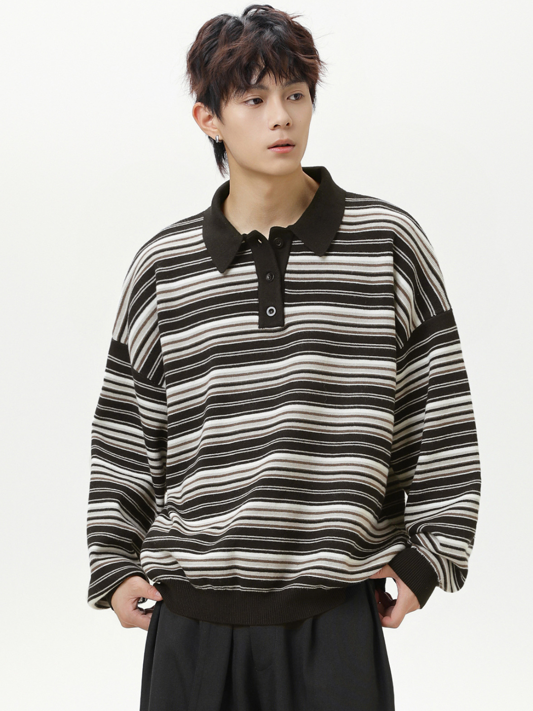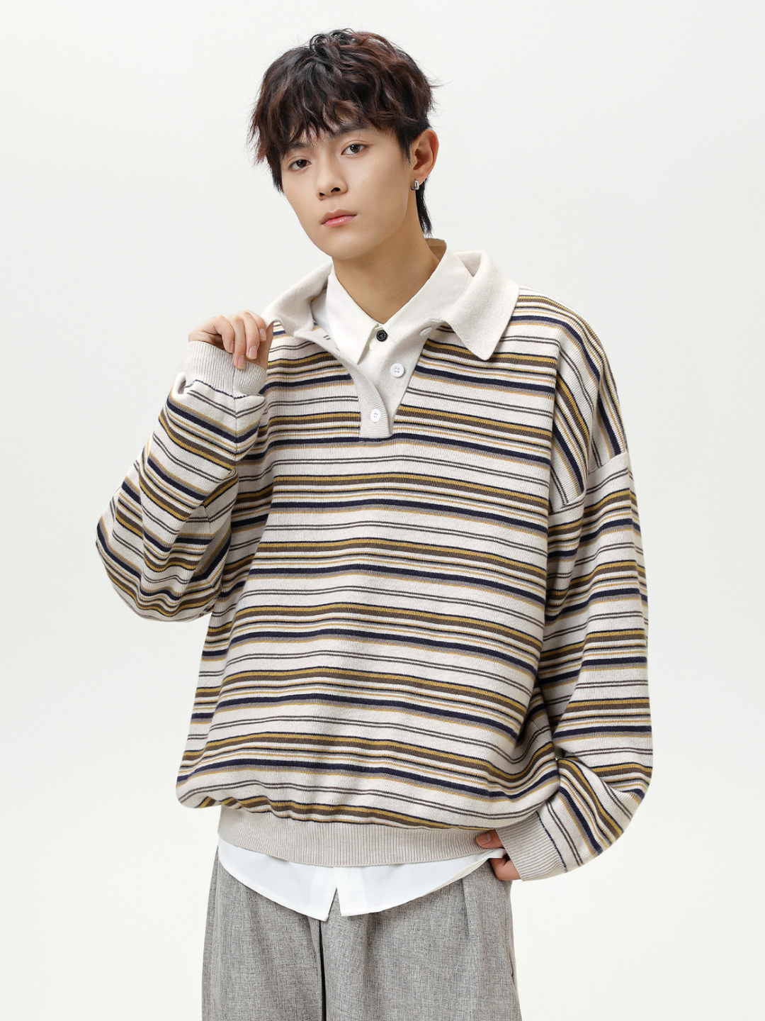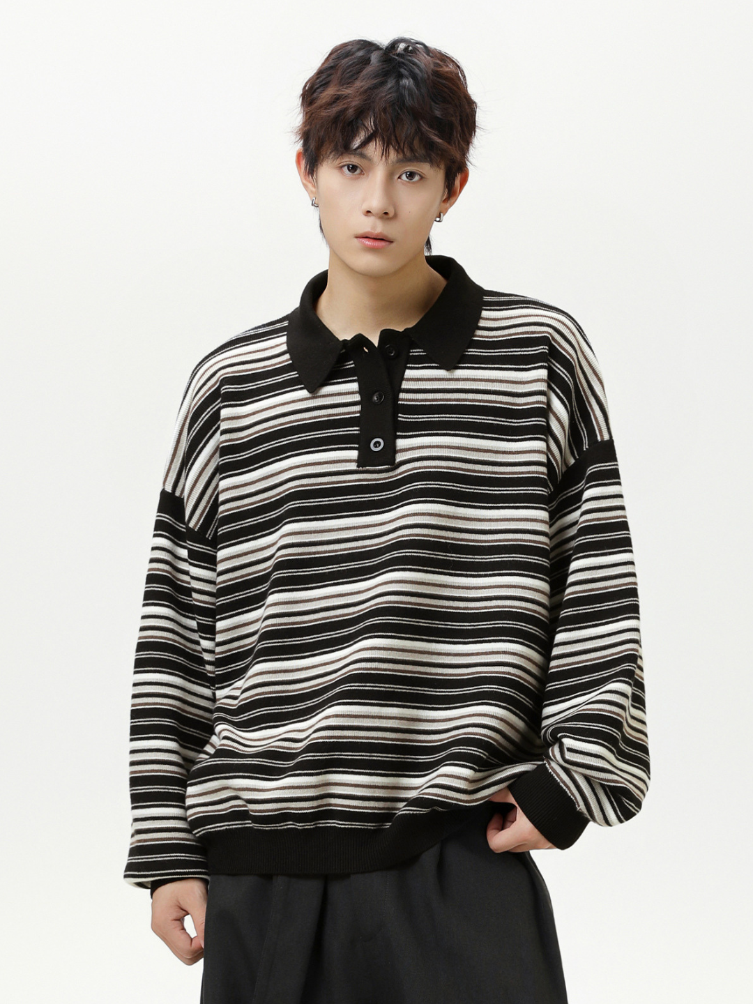 日系復古條紋針織長袖polo衫