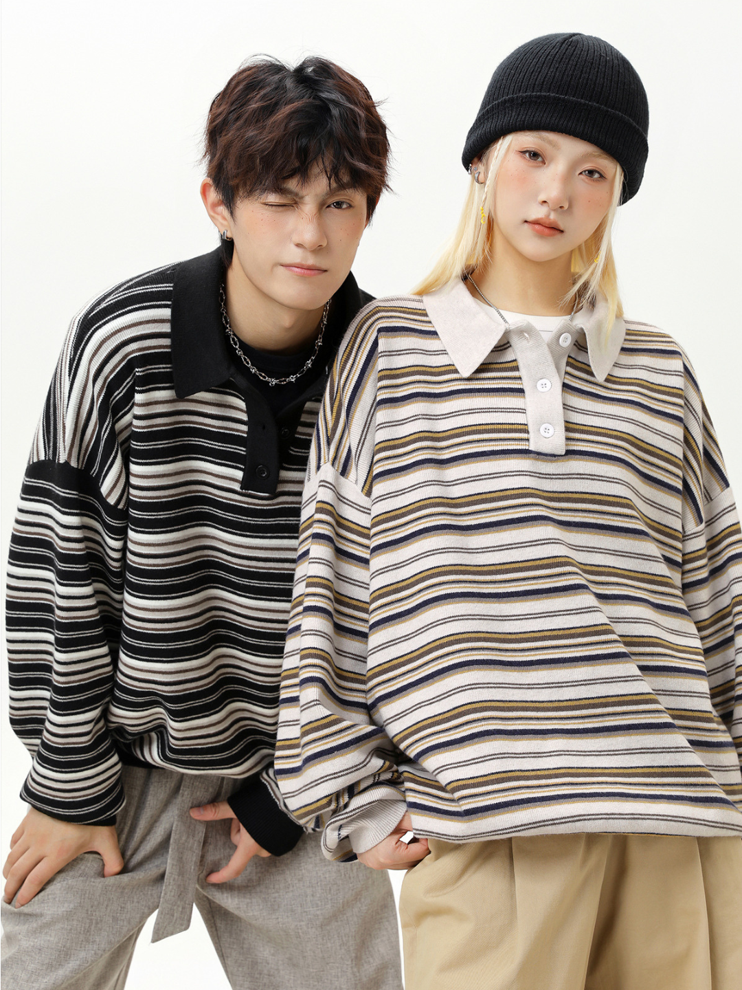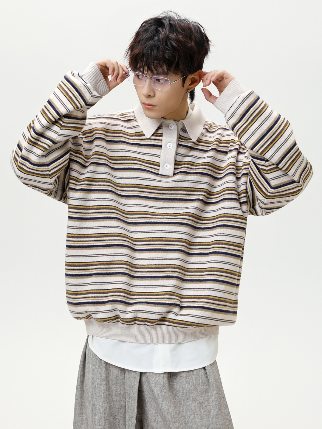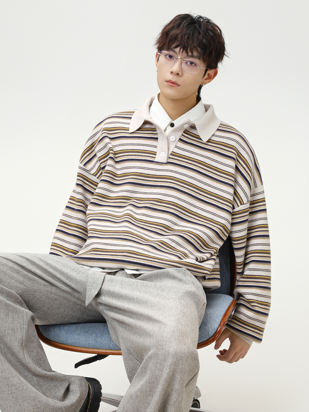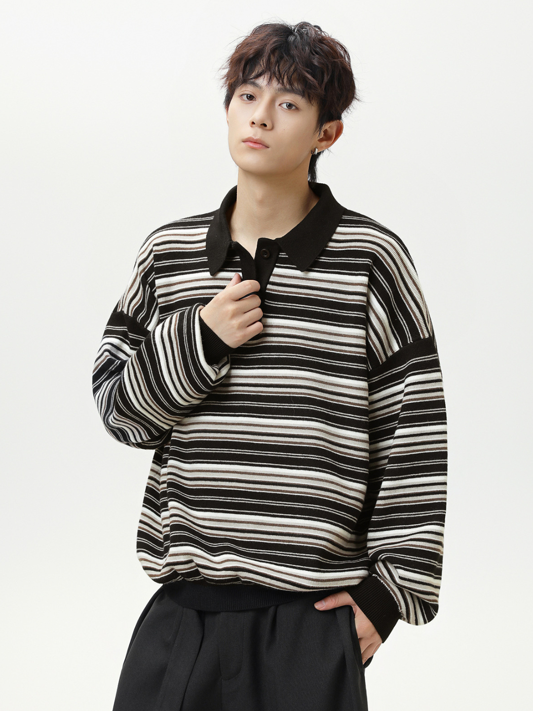 日系復古條紋針織長袖polo衫